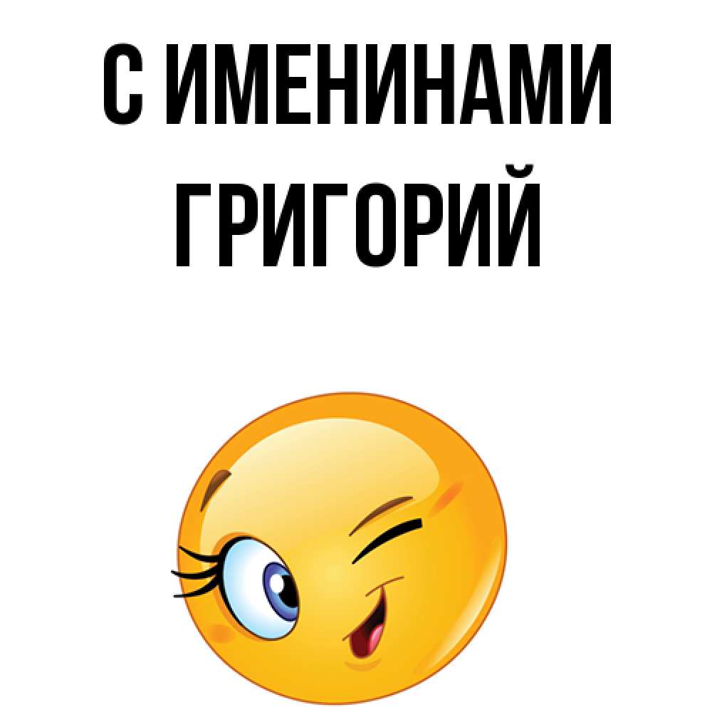 Открытка С именинами Григорий. Круглый смайл подмигивает и улыбается. хорошее настроение