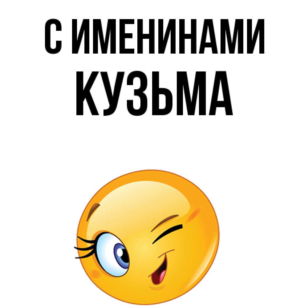 Открытка С именинами Кузьма. Круглый смайл подмигивает и улыбается. хорошее настроение