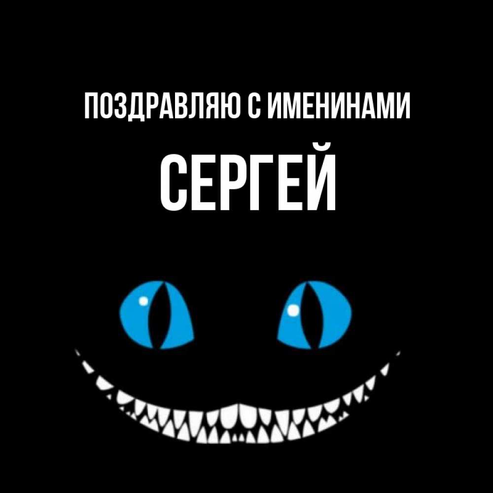Открытка Поздравляю с именинами Сергей. чеширский кот и утречко. голубые глаза и зубки