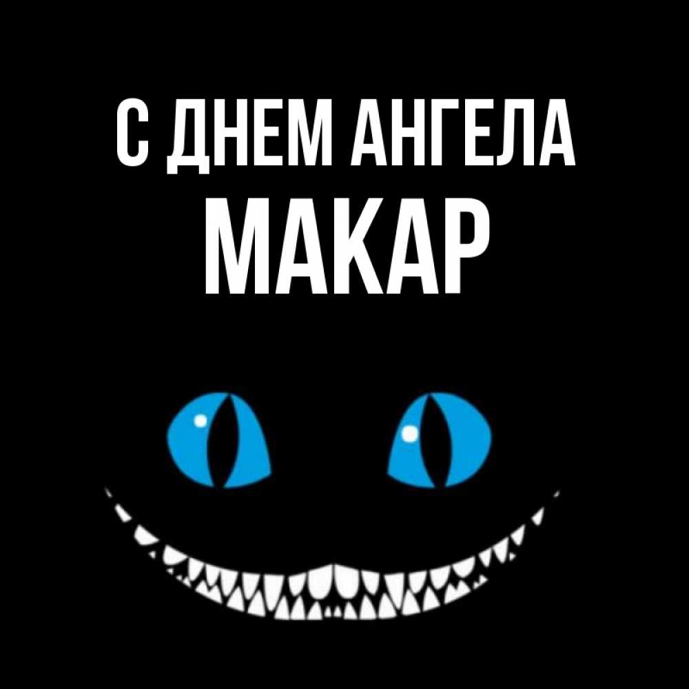 Открытка С днем Ангела Макар. чеширский кот и утречко. голубые глаза и зубки