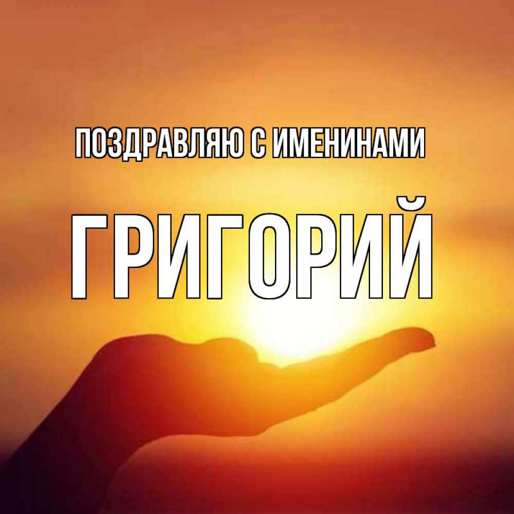 Открытка Поздравляю с именинами Григорий. солнце в руке. ладошка и закат