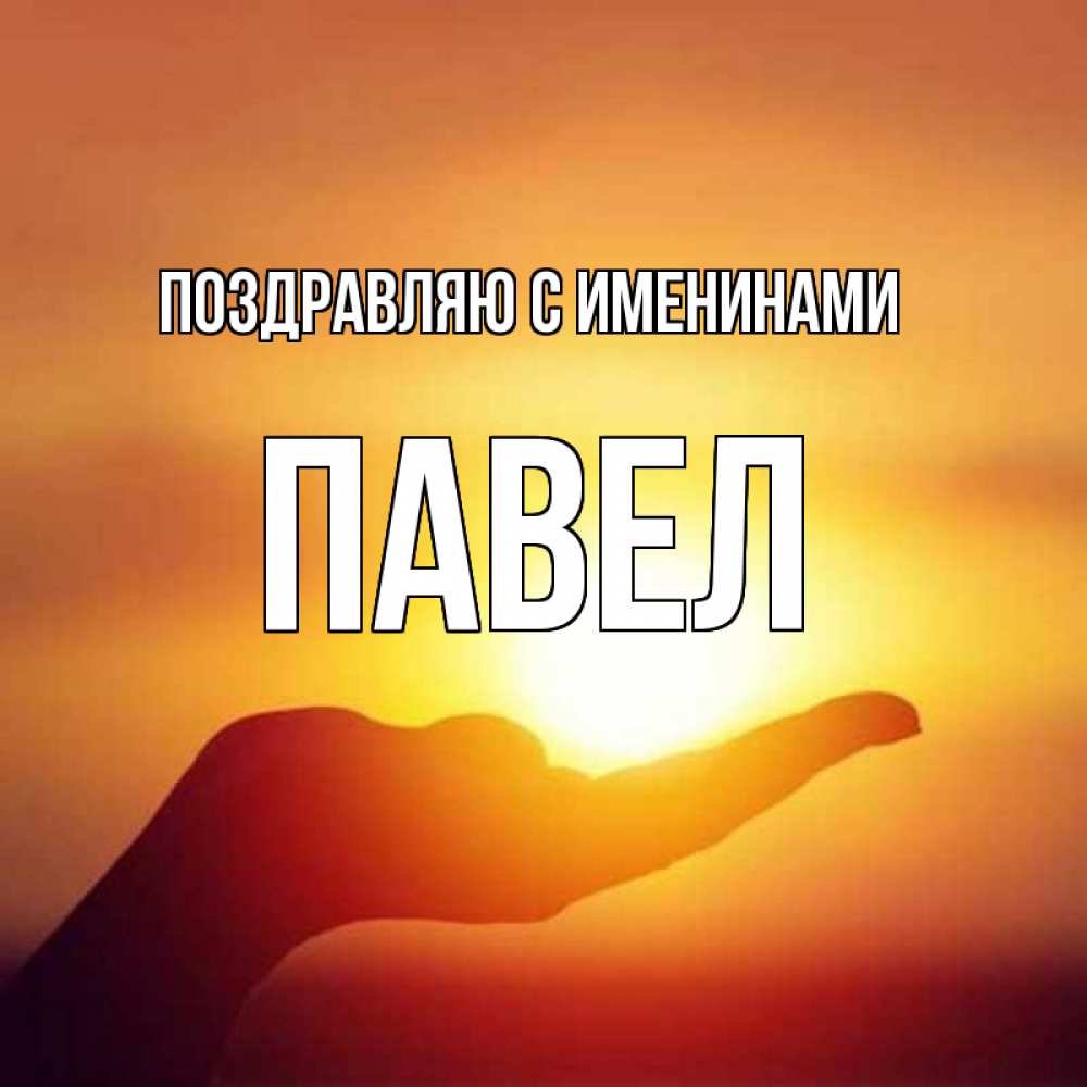 Открытка Поздравляю с именинами Павел. солнце в руке. ладошка и закат