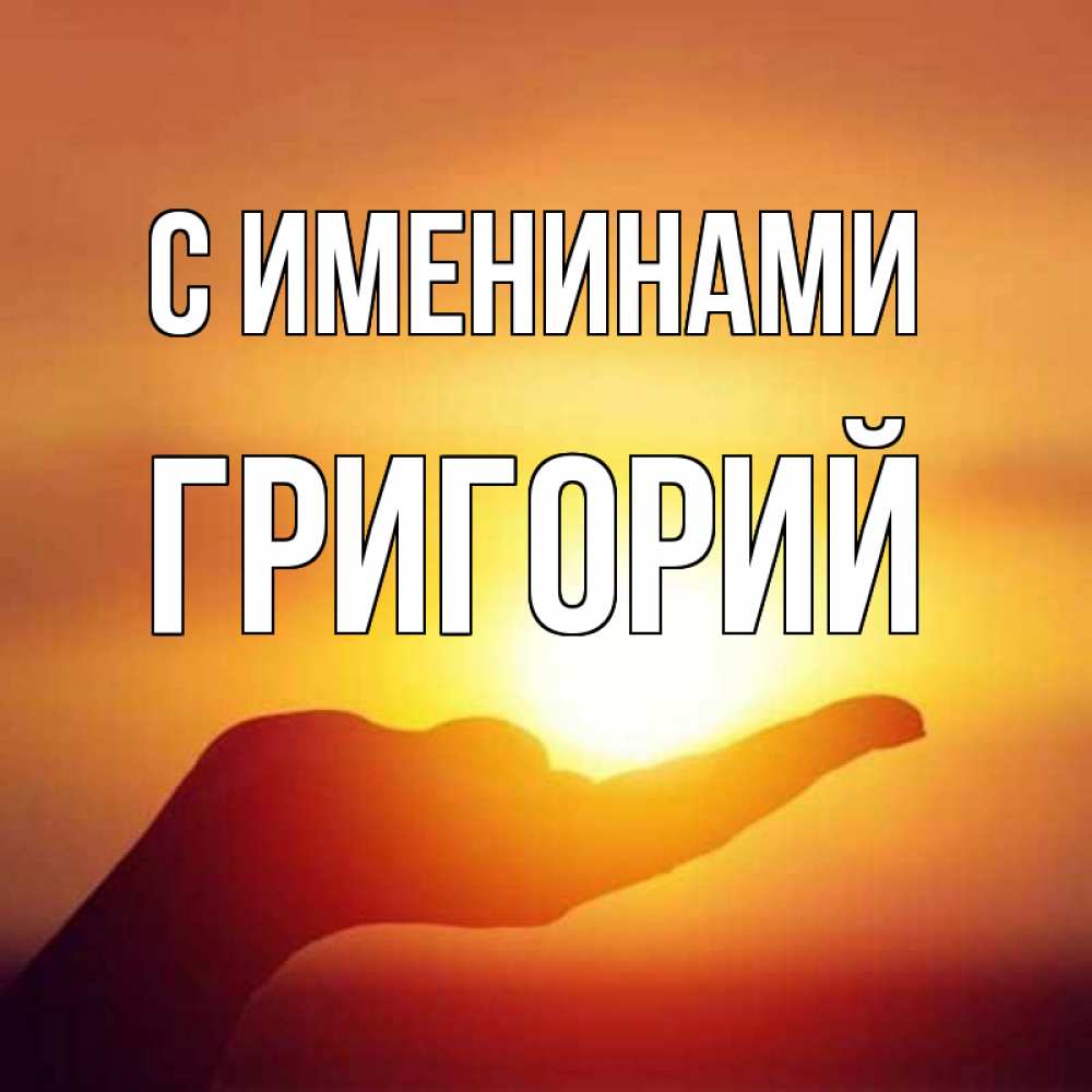 Открытка С именинами Григорий. солнце в руке. ладошка и закат