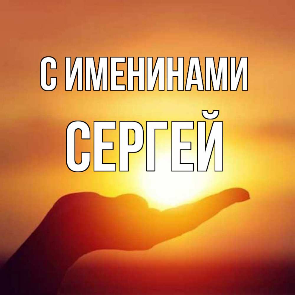 Открытка С именинами Сергей. солнце в руке. ладошка и закат