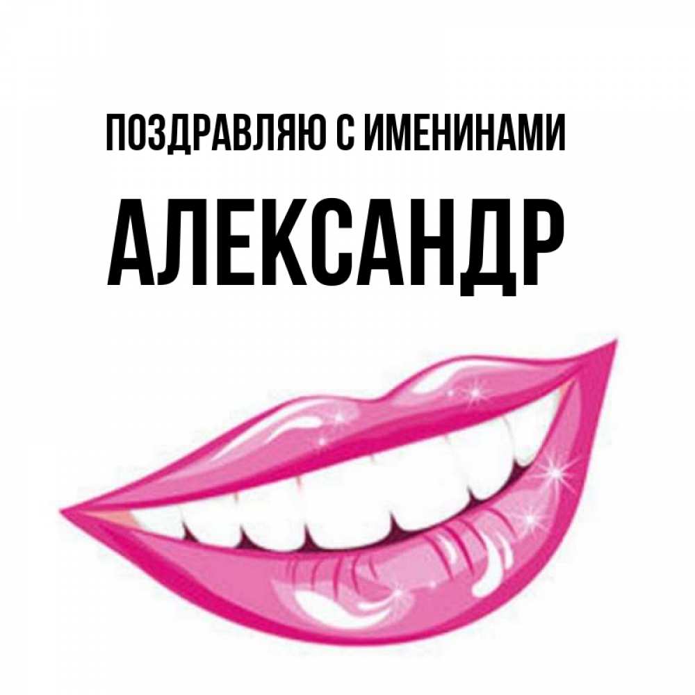 Открытка Поздравляю с именинами Александр. улыбка и губы. розовые губы и белые зубы