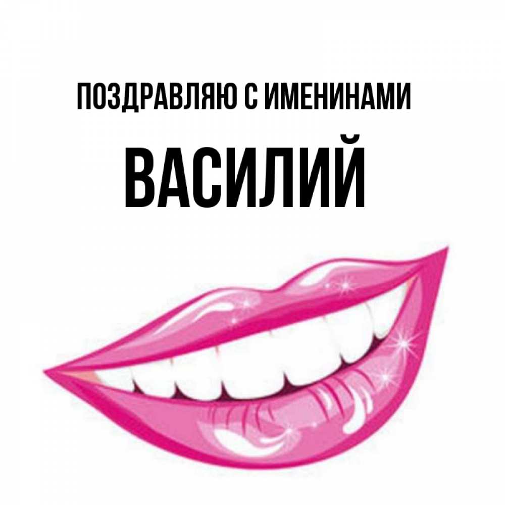 Открытка Поздравляю с именинами Василий. улыбка и губы. розовые губы и белые зубы