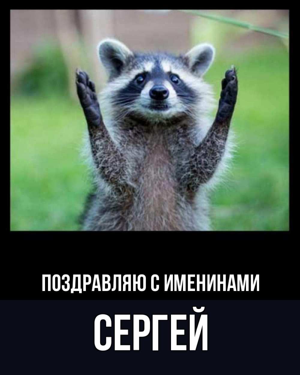 Открытка Поздравляю с именинами Сергей. енот позитив. хорошее настроение утречком