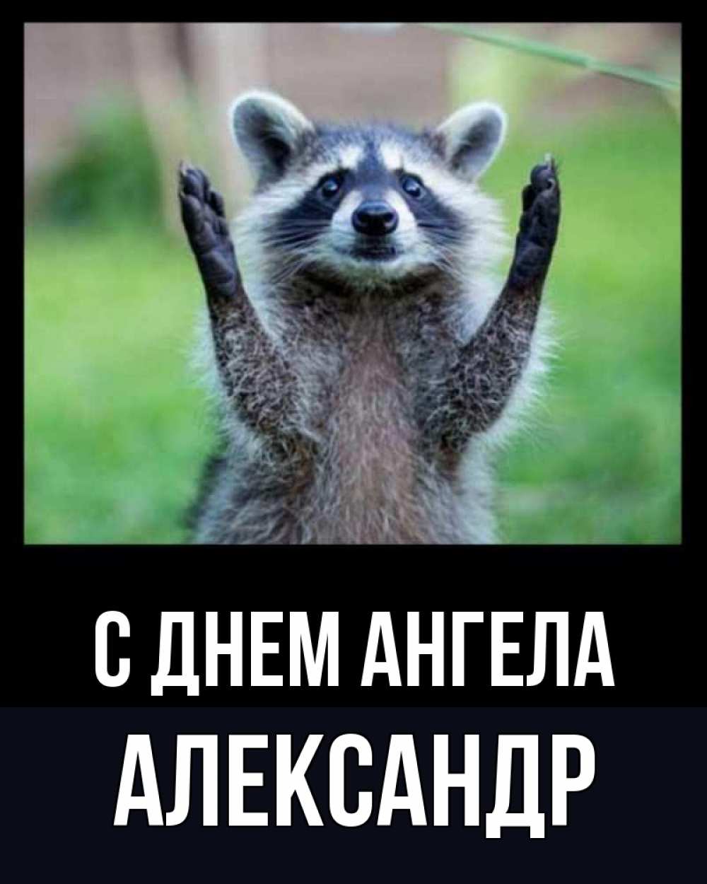 Открытка С днем Ангела Александр. енот позитив. хорошее настроение утречком