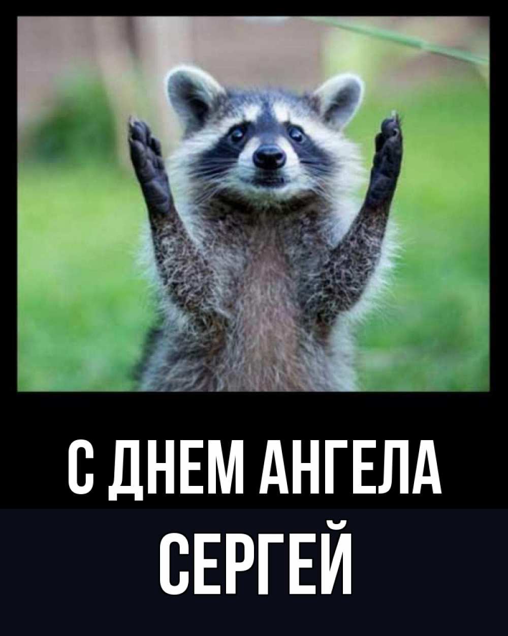 Открытка С днем Ангела Сергей. енот позитив. хорошее настроение утречком