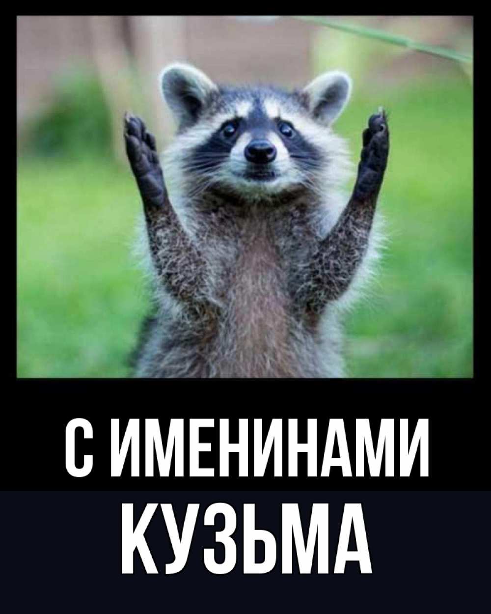 Открытка С именинами Кузьма. енот позитив. хорошее настроение утречком