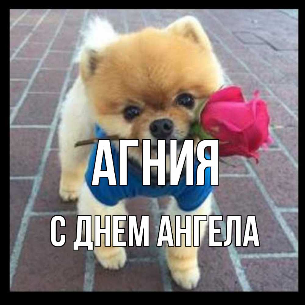 Открытка Агния С днем ангела. собка дарит розу. роза в зубах