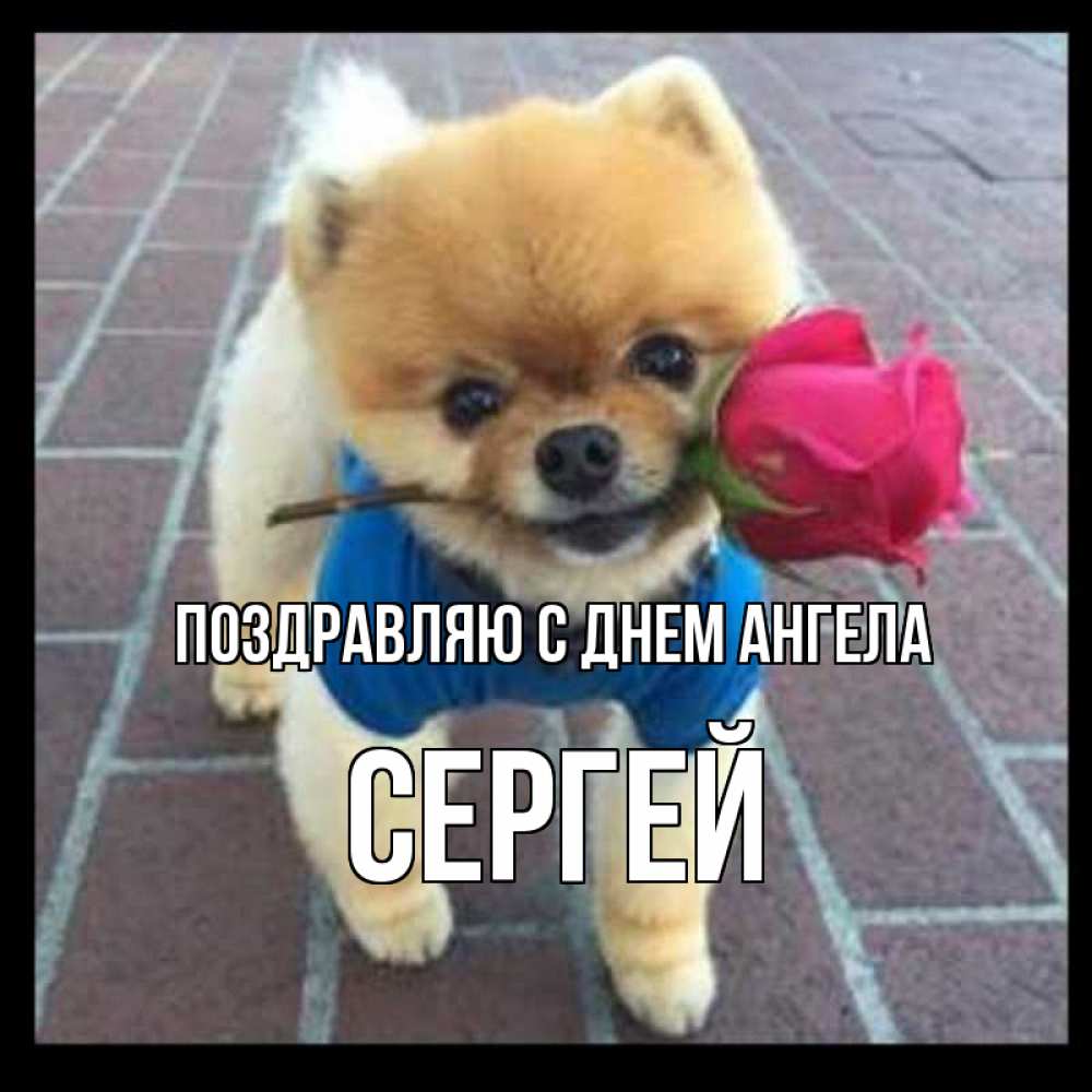 Открытка Поздравляю с днем Ангела Сергей. собка дарит розу. роза в зубах