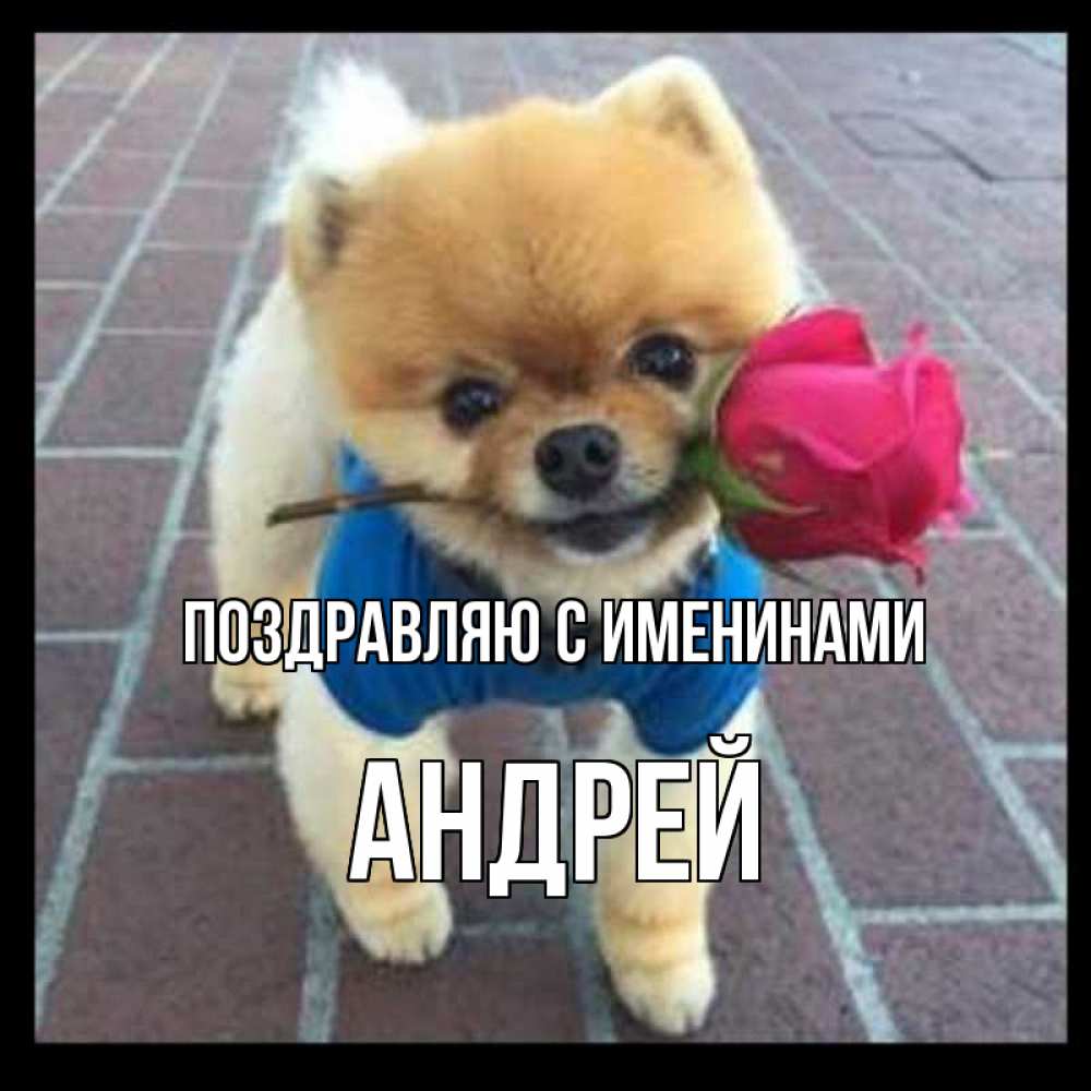 Открытка Поздравляю с именинами Андрей. собка дарит розу. роза в зубах