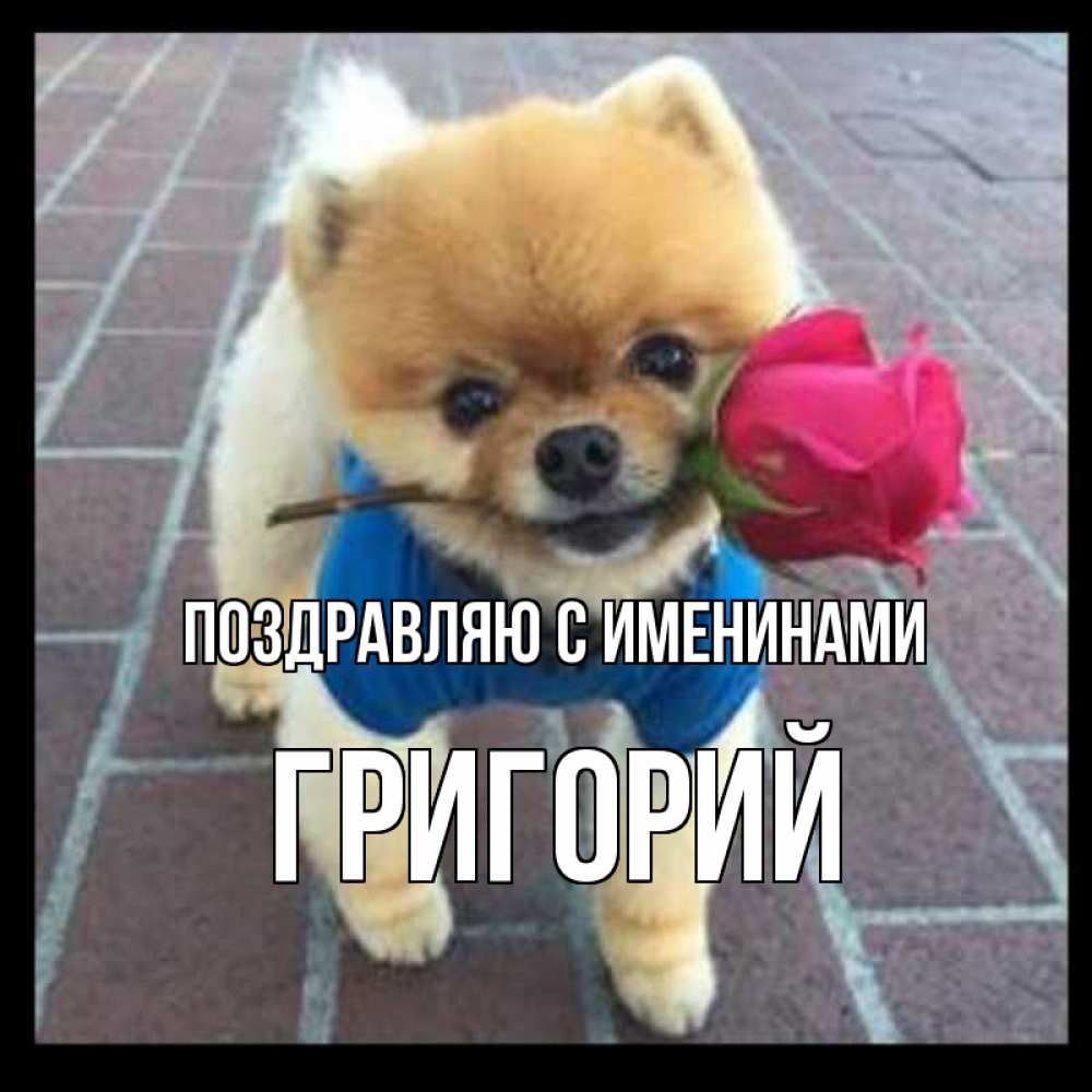 Открытка Поздравляю с именинами Григорий. собка дарит розу. роза в зубах