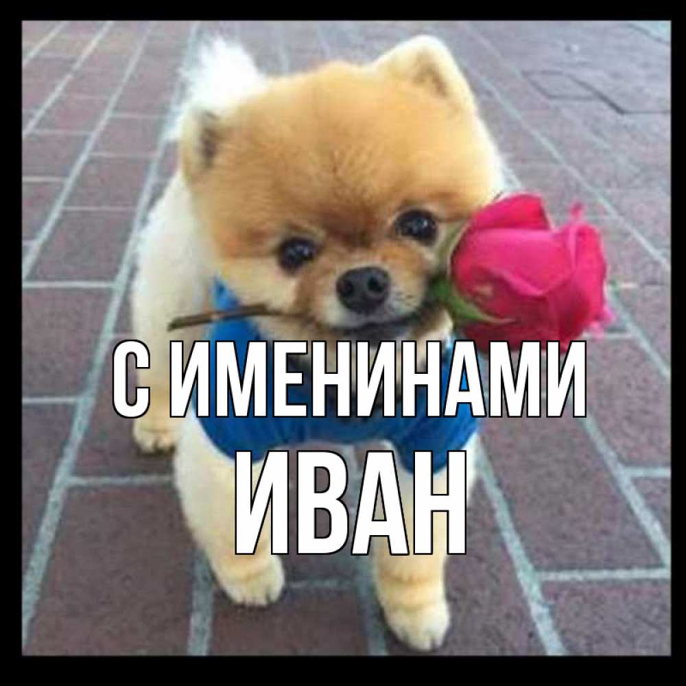 Открытка С именинами Иван. собка дарит розу. роза в зубах