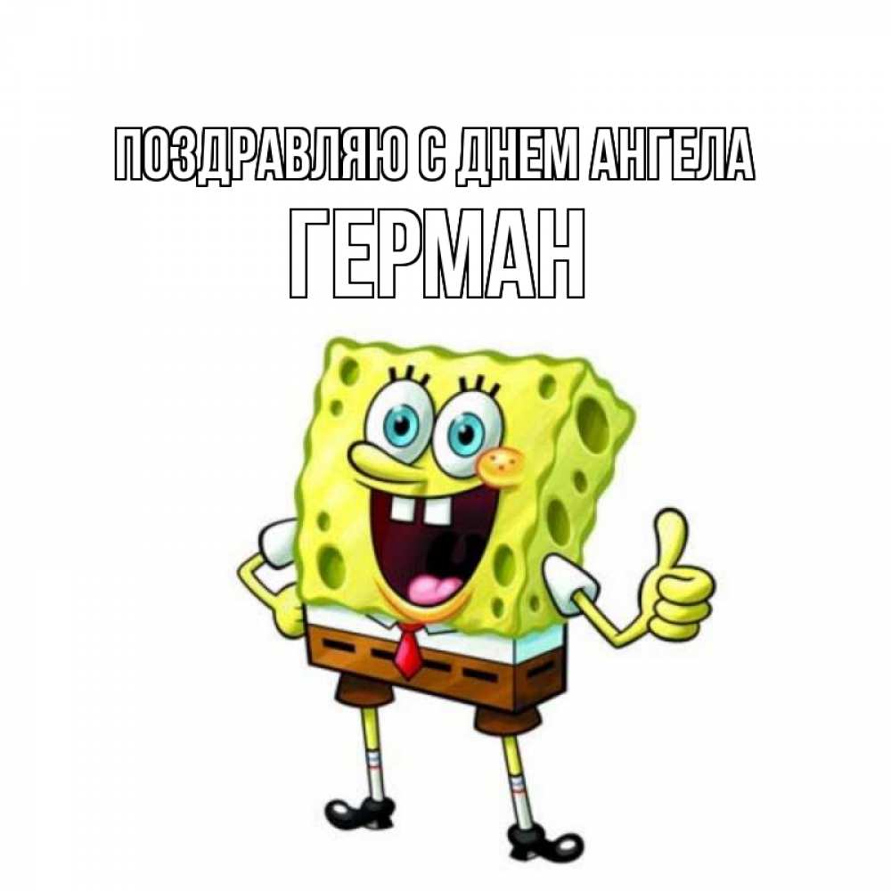 Открытка Поздравляю с днем Ангела Герман. спанч Боб с большой улыбкой. герои мультфильмов николодиум