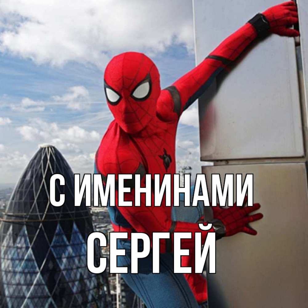 Открытка С именинами Сергей. Человек паук в Лондоне. марвел герои