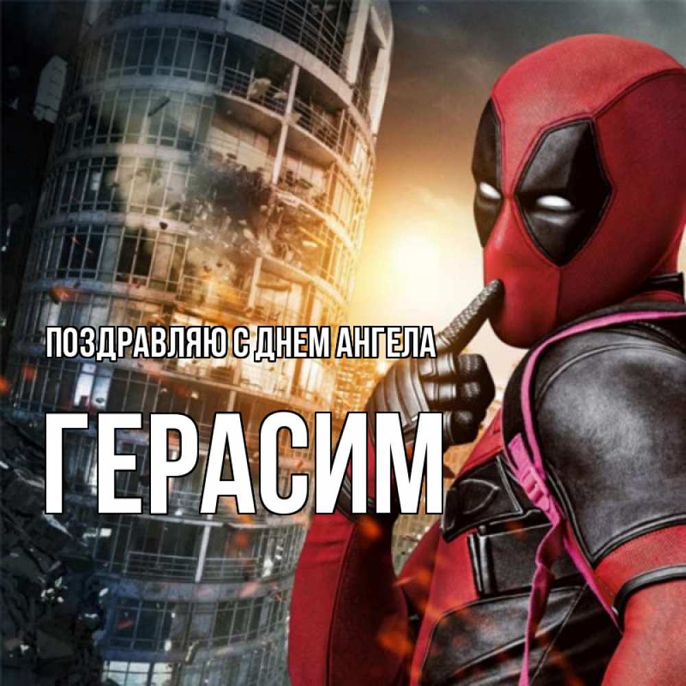 Открытка Поздравляю с днем Ангела Герасим. Дедпул желает всего хорошего. марвел и дедпул на фоне небоскреба