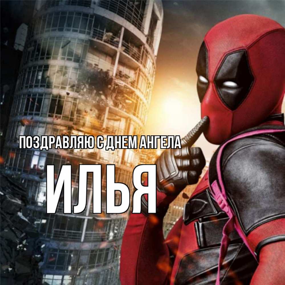 Открытка Поздравляю с днем Ангела Илья. Дедпул желает всего хорошего. марвел и дедпул на фоне небоскреба