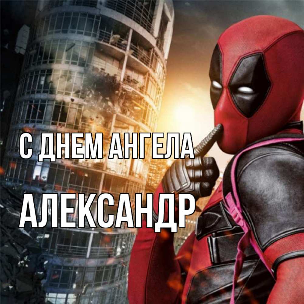 Открытка С днем Ангела Александр. Дедпул желает всего хорошего. марвел и дедпул на фоне небоскреба