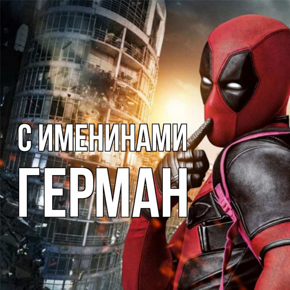 Открытка С именинами Герман. Дедпул желает всего хорошего. марвел и дедпул на фоне небоскреба