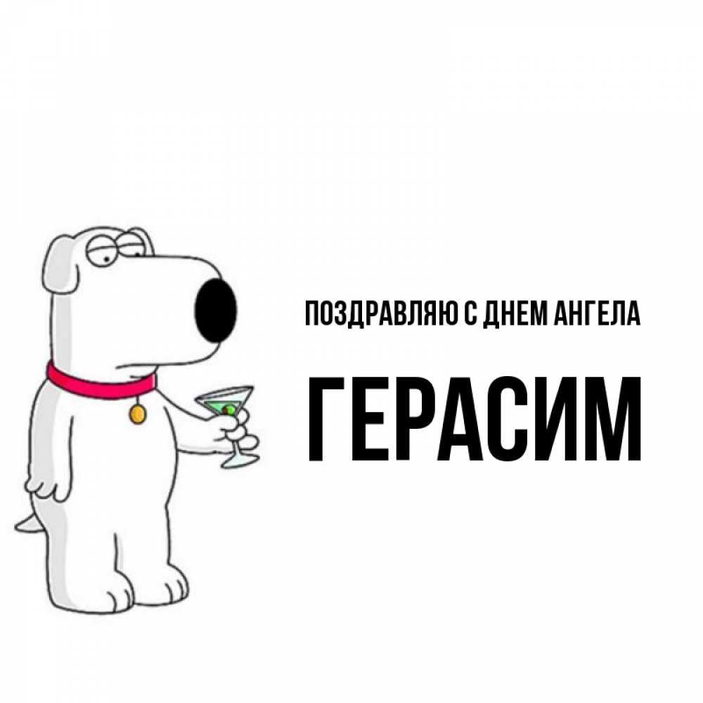 Открытка Поздравляю с днем Ангела Герасим. собака с рюмкой. герои мультфильмов белый пес