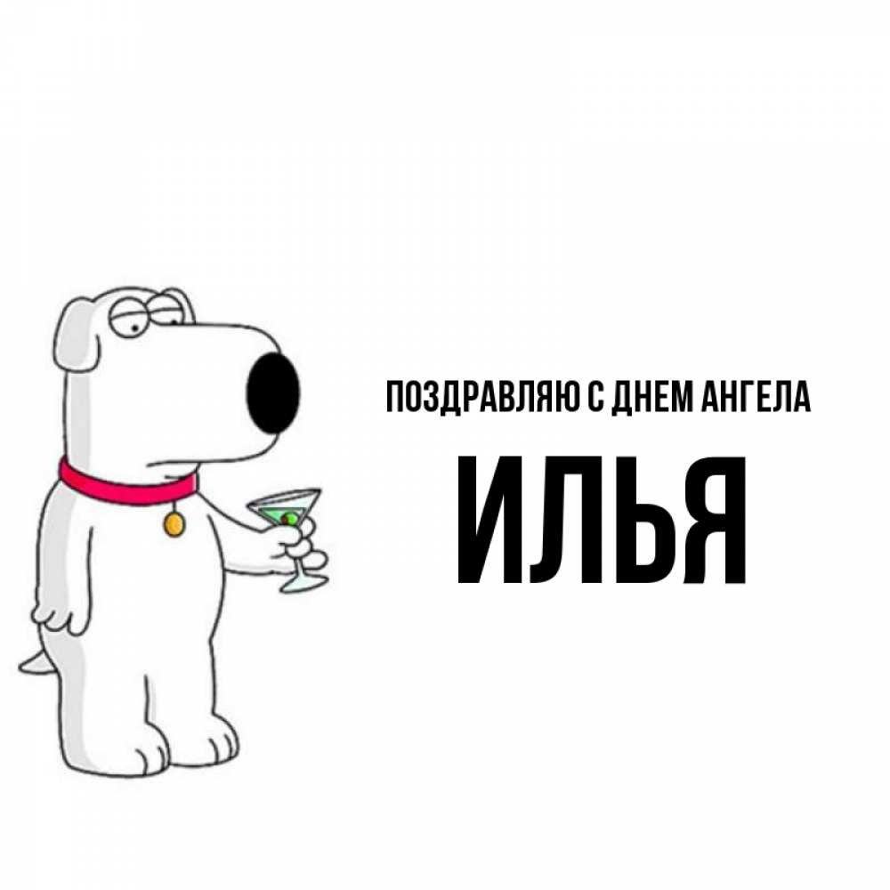 Открытка Поздравляю с днем Ангела Илья. собака с рюмкой. герои мультфильмов белый пес
