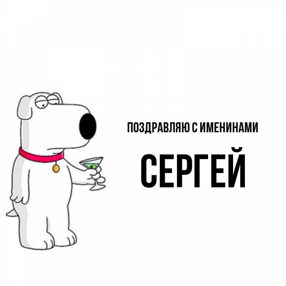 Открытка Поздравляю с именинами Сергей. собака с рюмкой. герои мультфильмов белый пес