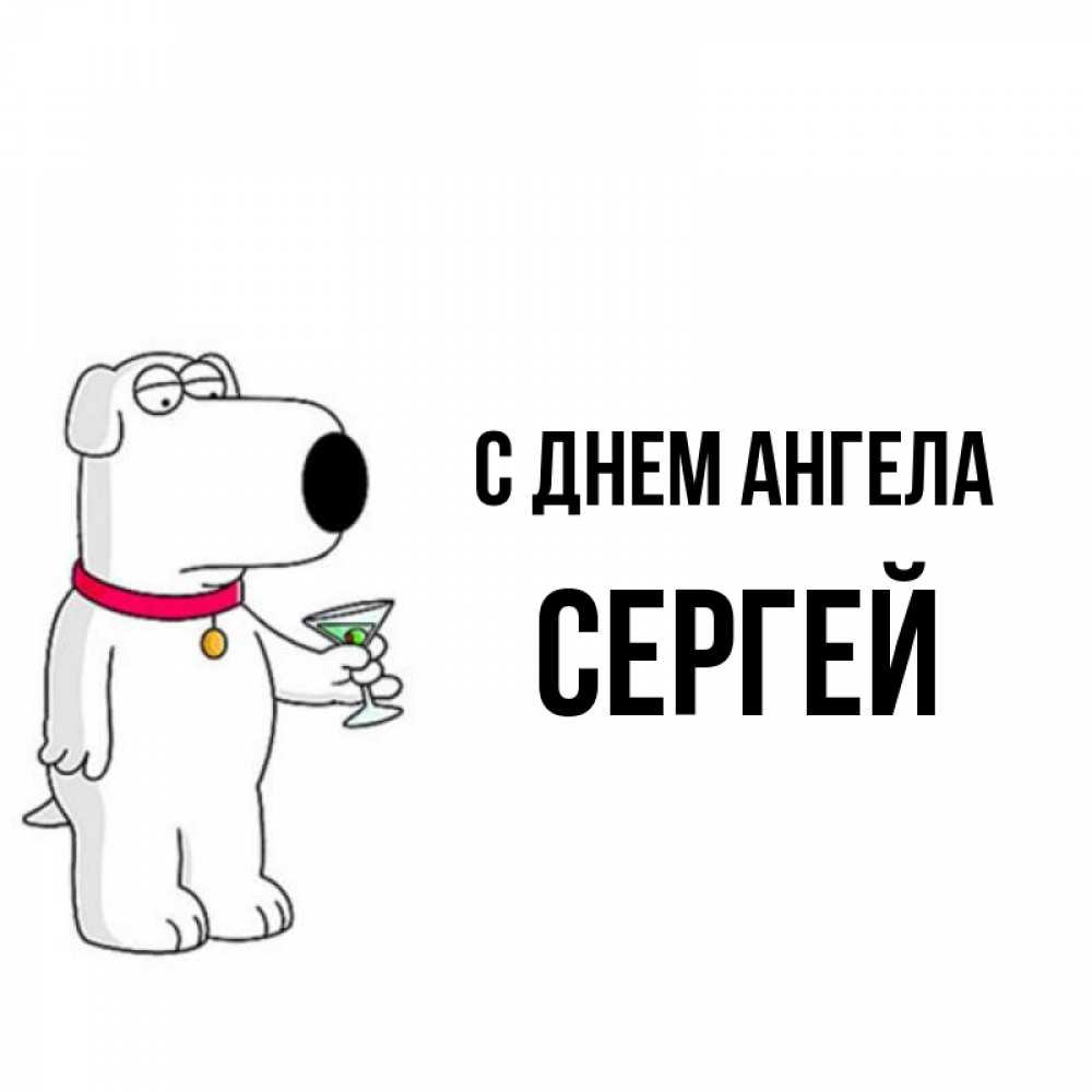 Открытка С днем Ангела Сергей. собака с рюмкой. герои мультфильмов белый пес