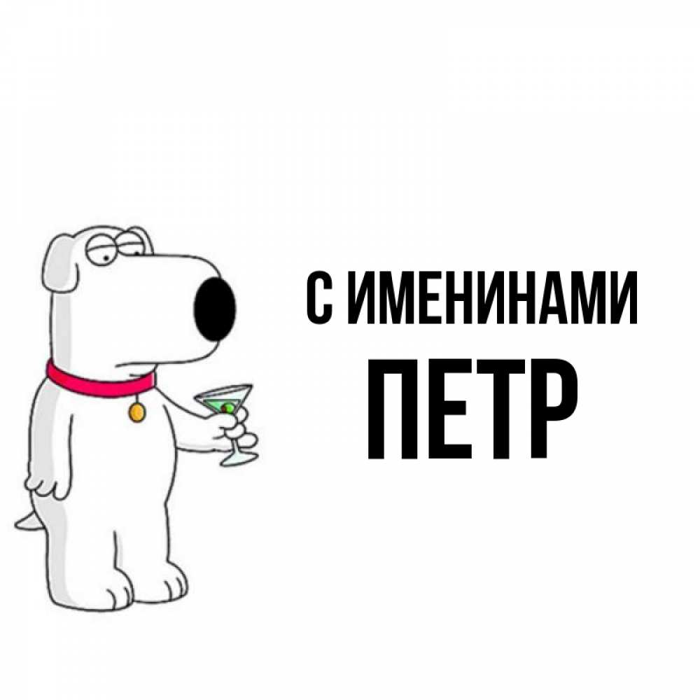 Открытка С именинами Петр. собака с рюмкой. герои мультфильмов белый пес