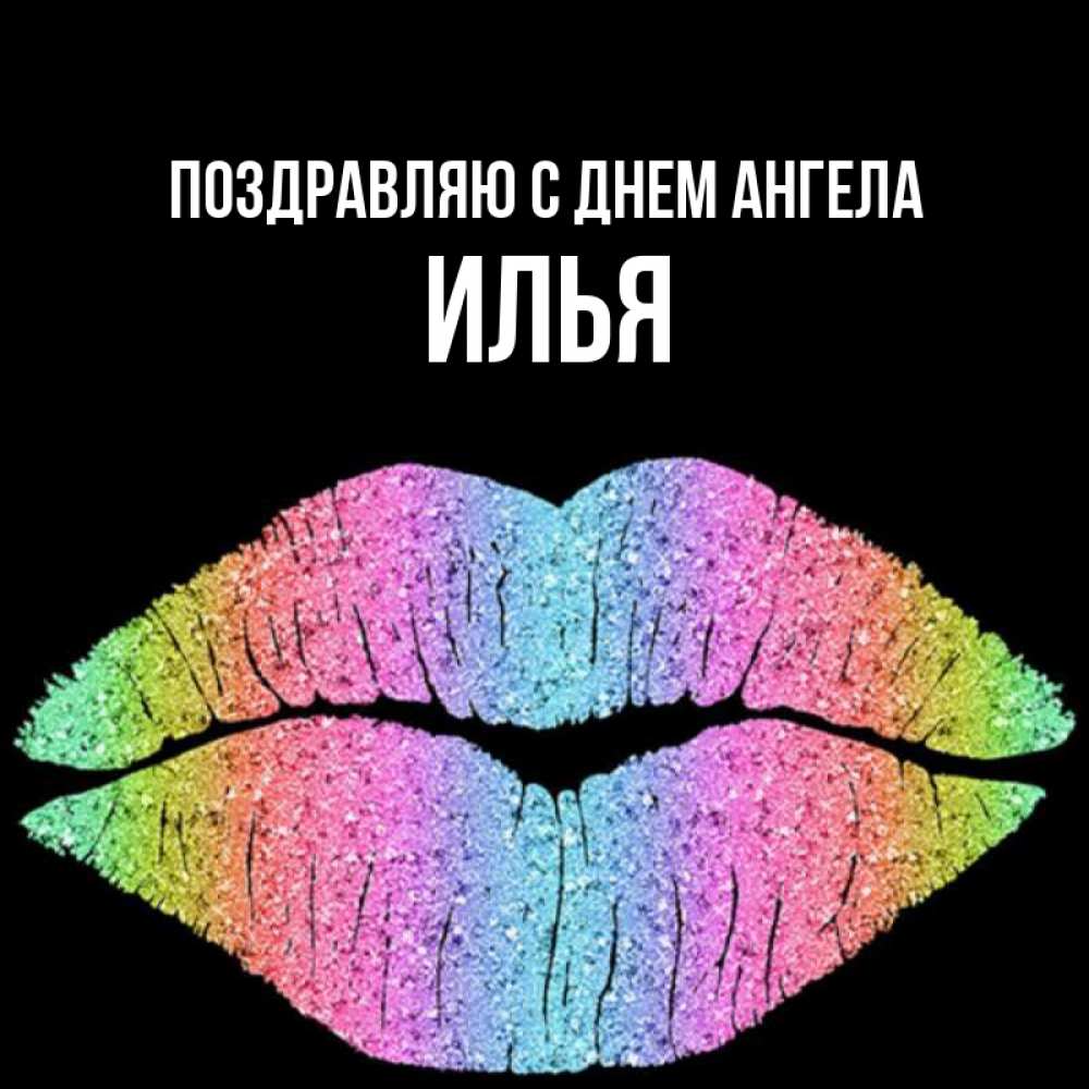 Открытка Поздравляю с днем Ангела Илья. утренний поцелуй на черном фоне. радужные губы