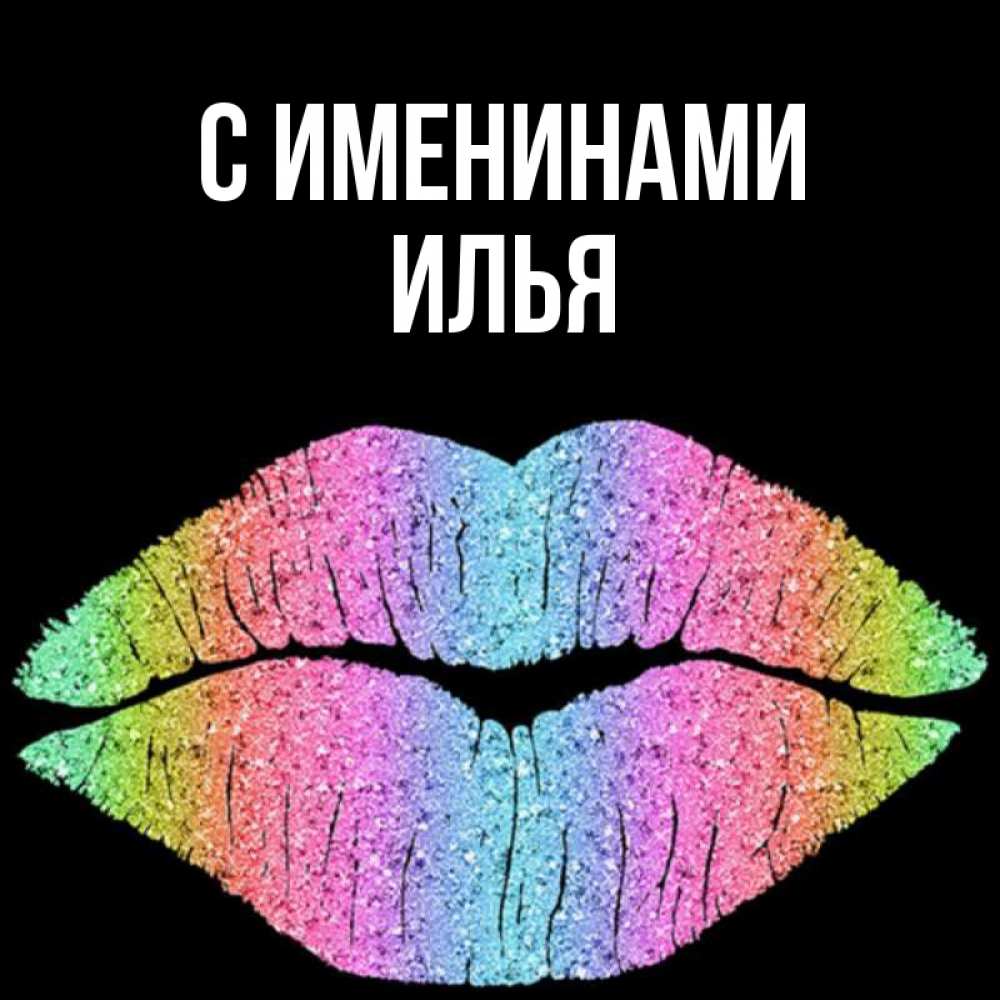 Открытка С именинами Илья. утренний поцелуй на черном фоне. радужные губы