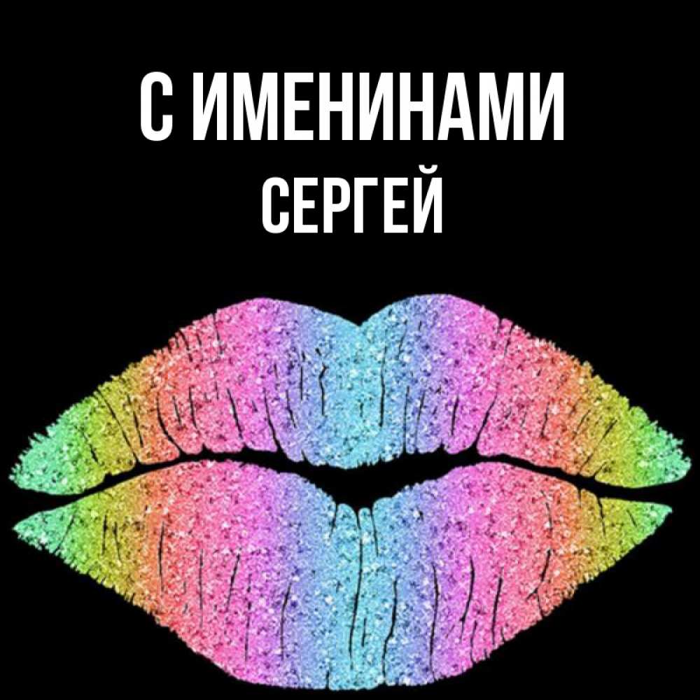 Открытка С именинами Сергей. утренний поцелуй на черном фоне. радужные губы