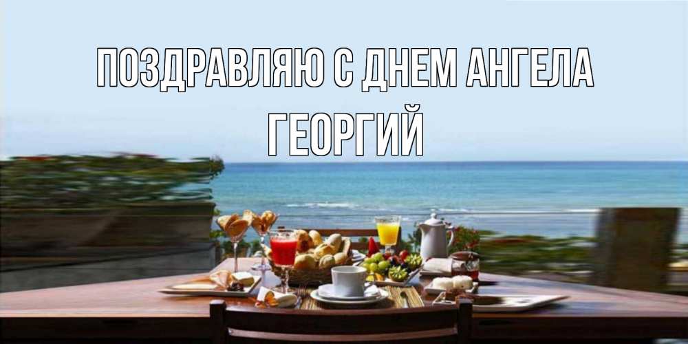 Открытка Поздравляю с днем Ангела Георгий. завтрак с видом на море. море, завтрак