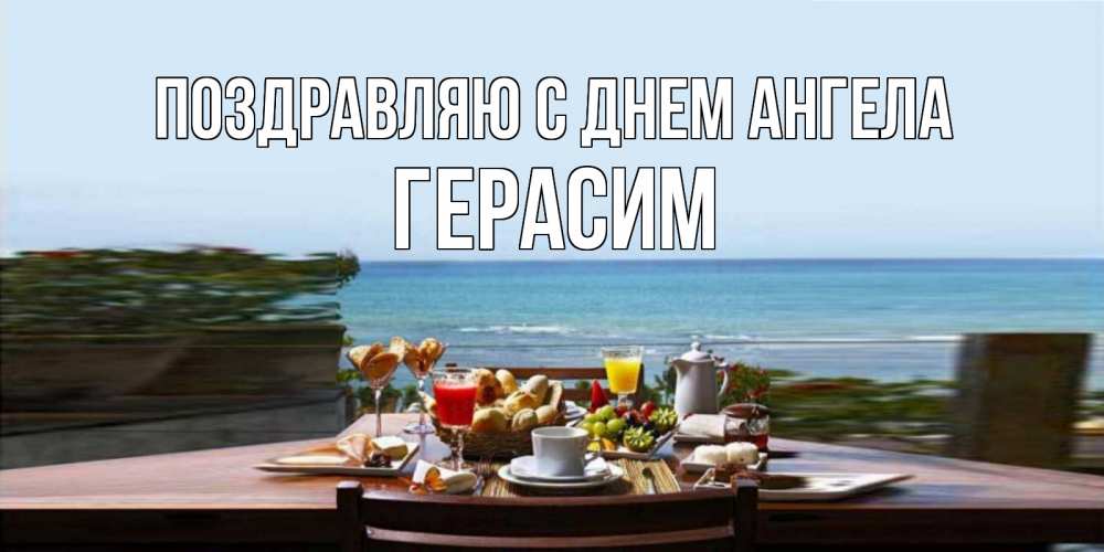 Открытка Поздравляю с днем Ангела Герасим. завтрак с видом на море. море, завтрак