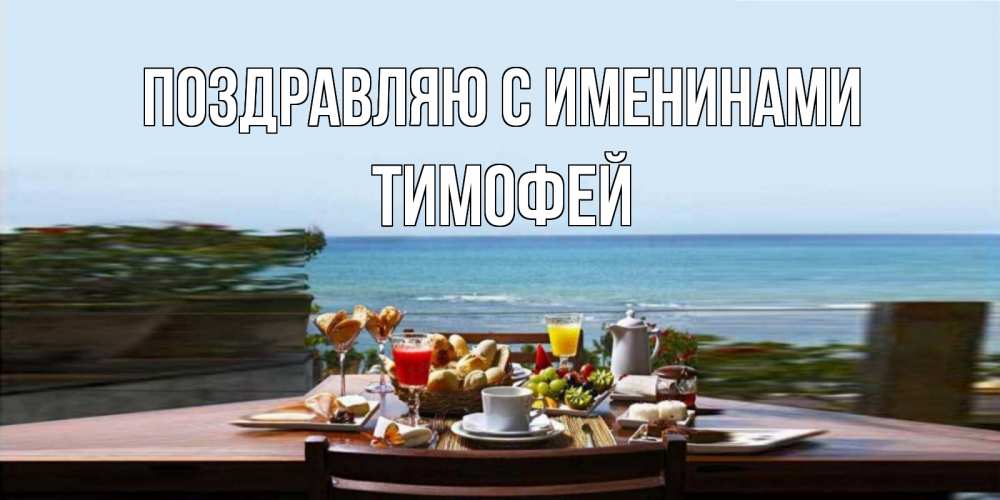 Открытка Поздравляю с именинами Тимофей. завтрак с видом на море. море, завтрак