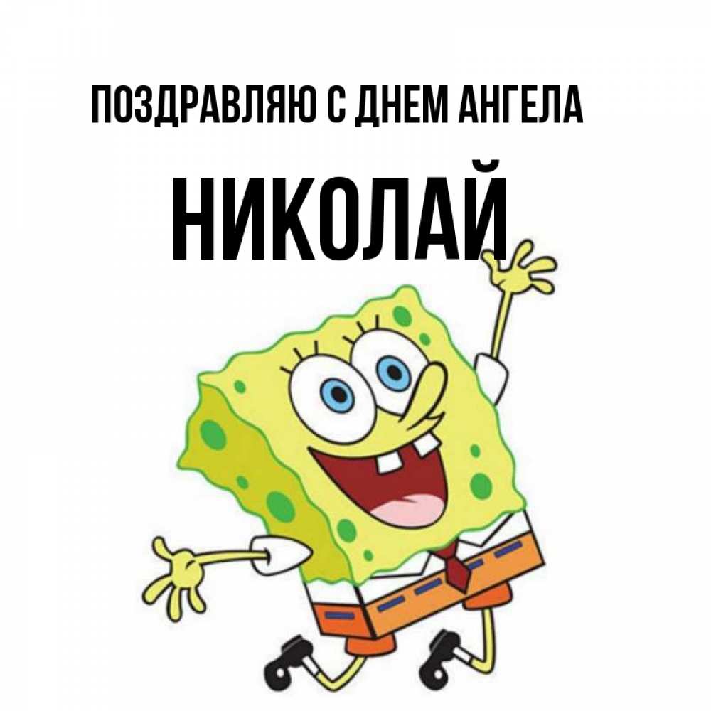 Открытка Поздравляю с днем Ангела Николай. губка боб в прыжке. улыбающийся спанч Боб