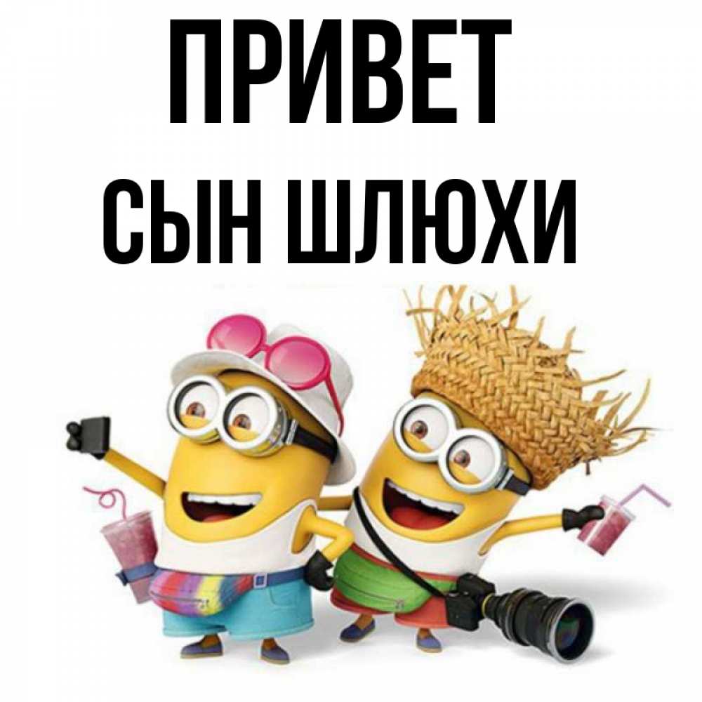 Открытка Привет Сын шлюхи. миньоны в карнавальных костюмах. карнавал