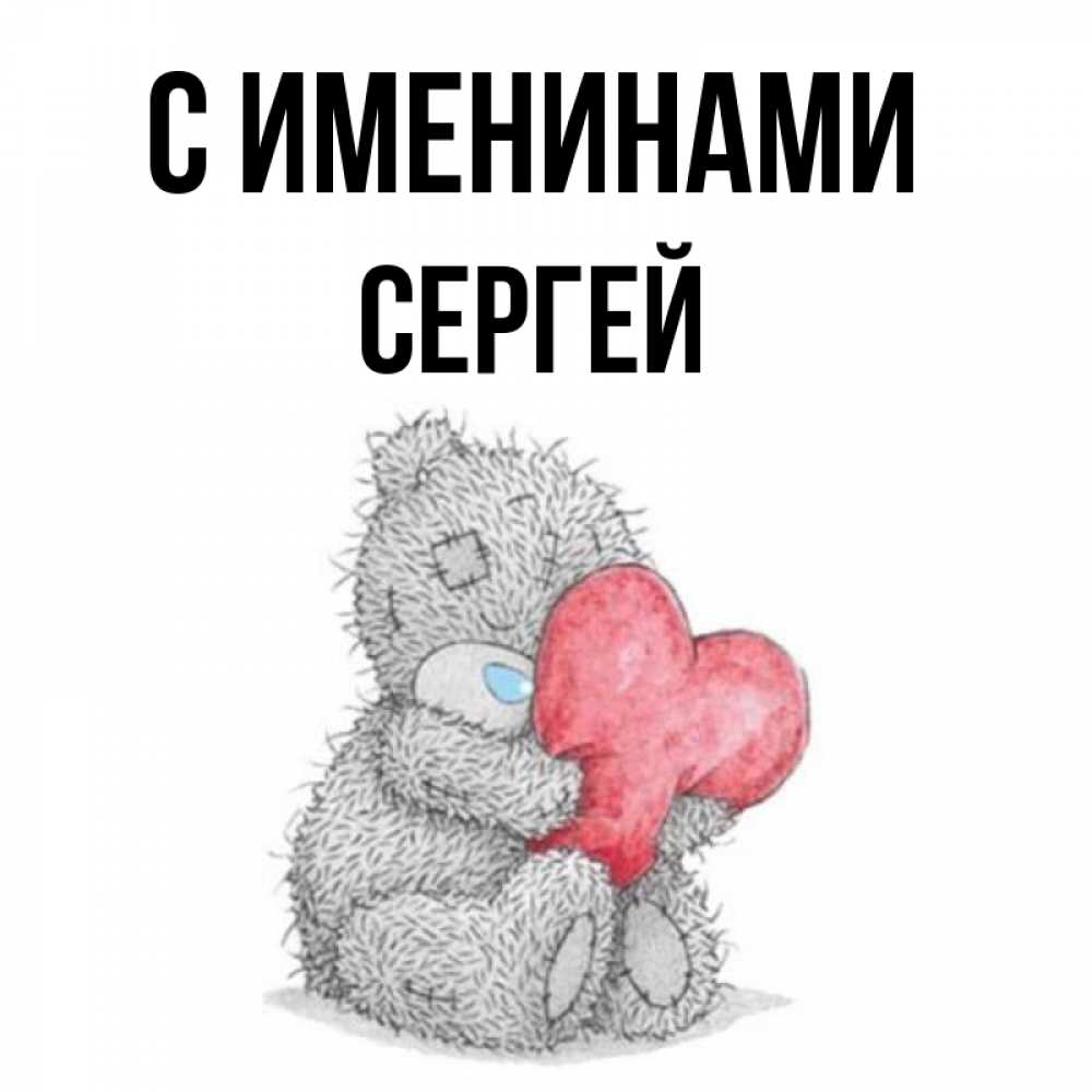 Открытка С именинами Сергей. мишка тедди с сердечком. плюшевые игрушки