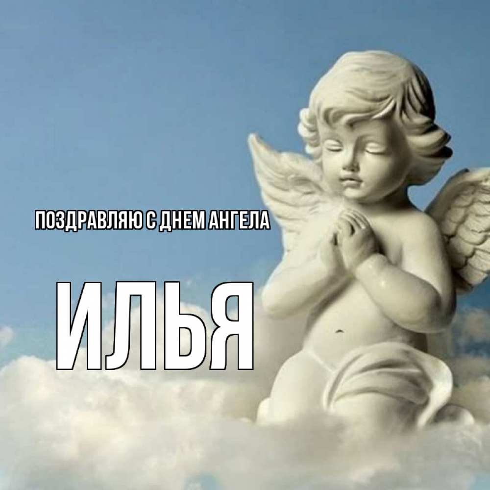 Открытка Поздравляю с днем Ангела Илья. ангел желает хорошего утра. скульптура ангела сидящего на облаке