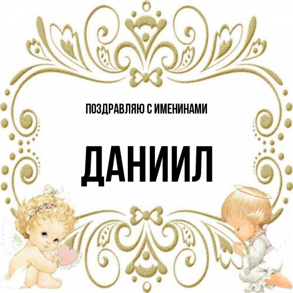 Открытка Поздравляю с именинами Даниил. Ангелы и красивая рамочка. с именинами поздравляют два красивых ангела. Один с сердечком другой молится