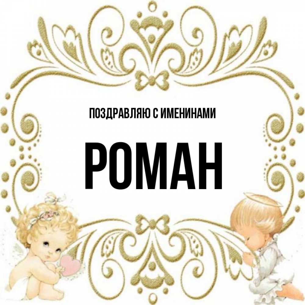 Открытка Поздравляю с именинами Роман. Ангелы и красивая рамочка. с именинами поздравляют два красивых ангела. Один с сердечком другой молится