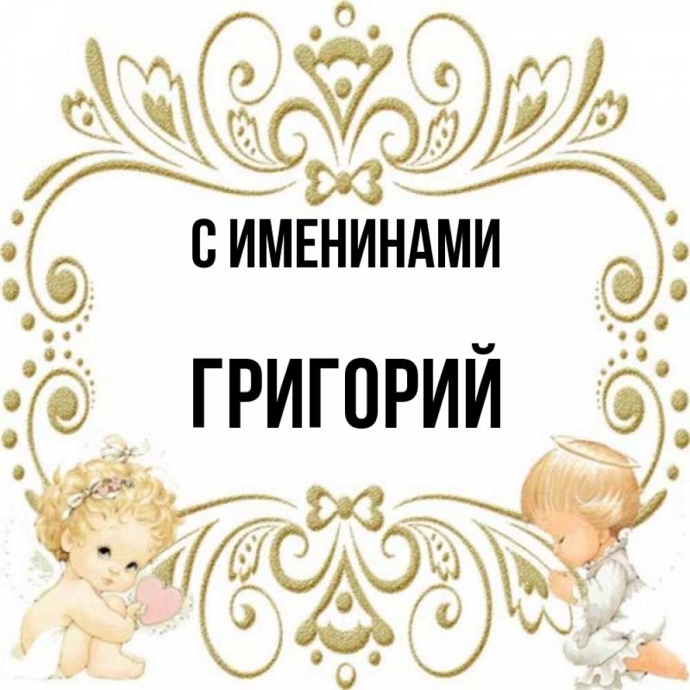 Открытка С именинами Григорий. Ангелы и красивая рамочка. с именинами поздравляют два красивых ангела. Один с сердечком другой молится
