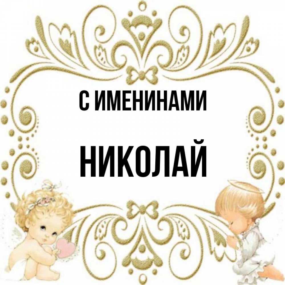 Открытка С именинами Николай. Ангелы и красивая рамочка. с именинами поздравляют два красивых ангела. Один с сердечком другой молится