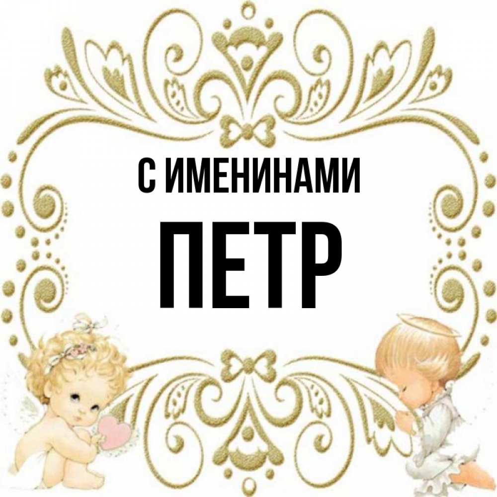 Открытка С именинами Петр. Ангелы и красивая рамочка. с именинами поздравляют два красивых ангела. Один с сердечком другой молится