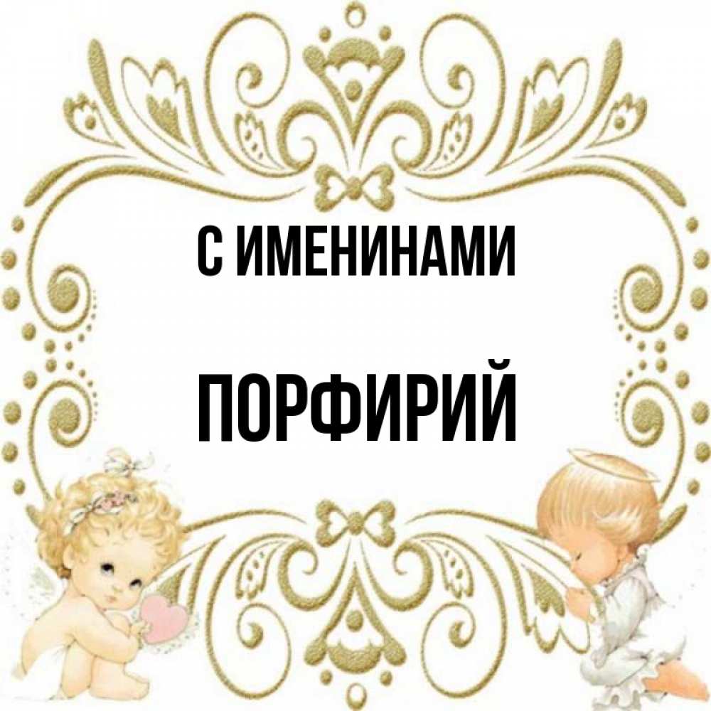 Открытка С именинами Порфирий. Ангелы и красивая рамочка. с именинами поздравляют два красивых ангела. Один с сердечком другой молится