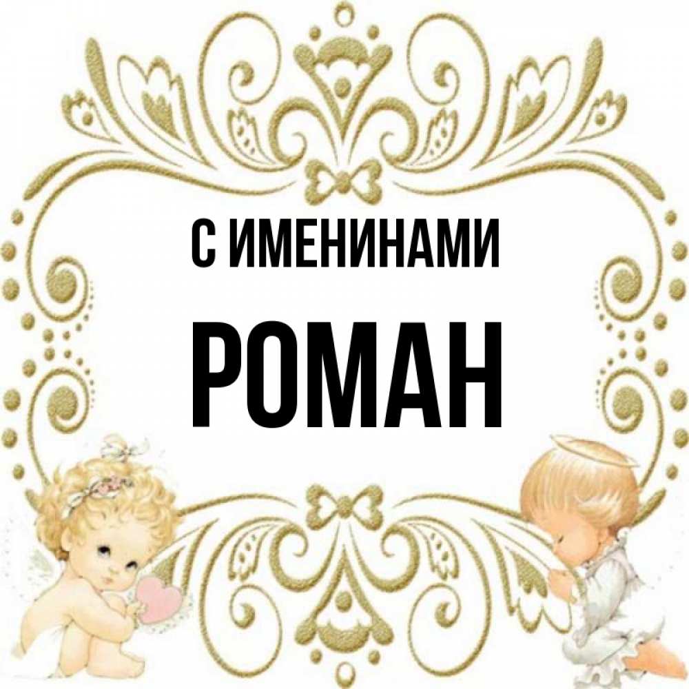 Открытка С именинами Роман. Ангелы и красивая рамочка. с именинами поздравляют два красивых ангела. Один с сердечком другой молится