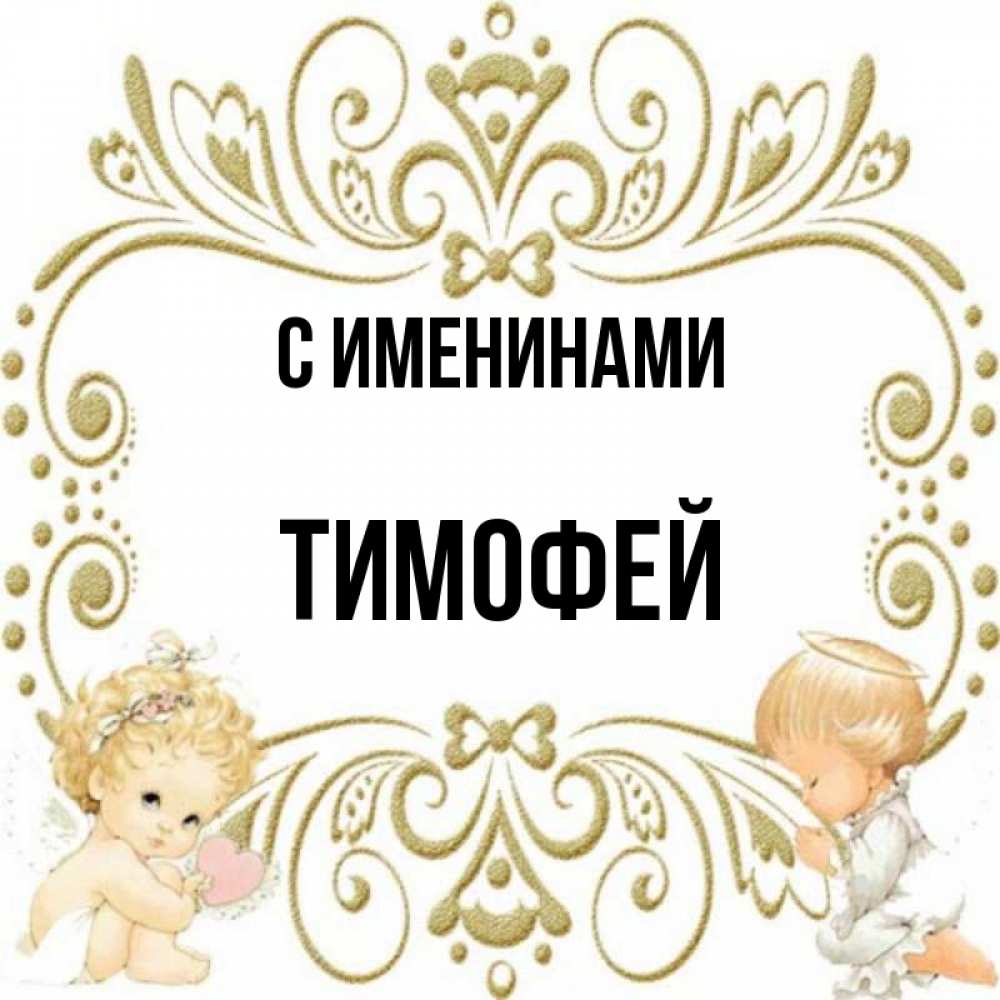 Открытка С именинами Тимофей. Ангелы и красивая рамочка. с именинами поздравляют два красивых ангела. Один с сердечком другой молится