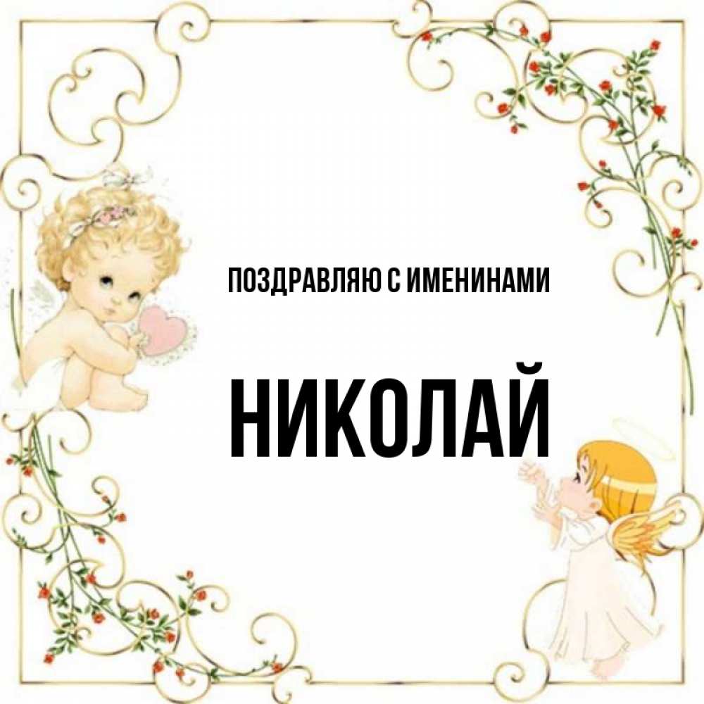 Открытка Поздравляю с именинами Николай. Ангелы в рамочке с цветами. ангелы желают прекрасных именин
