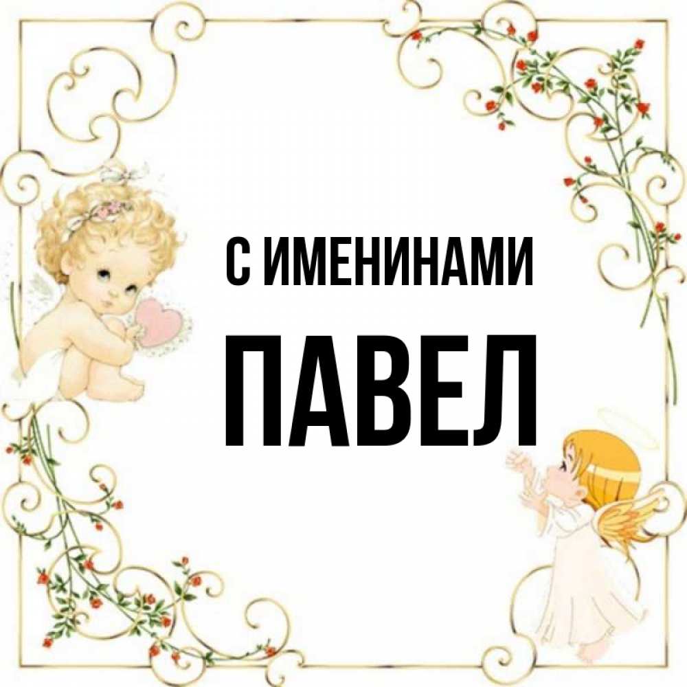 Открытка С именинами Павел. Ангелы в рамочке с цветами. ангелы желают прекрасных именин